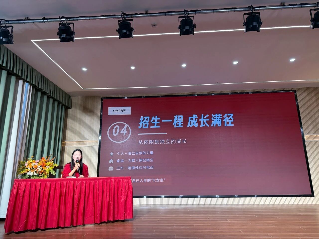 陈老师以飒爽的姿态,分享了从会计转行,历经网宣、地推锤炼的成长之路。她讲述了怀孕八月仍奔波宣讲、月跑上万公里的拼搏,以及面对恶意竞争时学校的坚定支持。她将招生“秘籍”归结为“恒心、耐心、诚心”:笃定职教价值、深耕细作、以诚相待。她强调,招生不是一锤子买卖,而是长期的真心陪伴。她鼓励大家跳出舒适区,独立自强,在招生工作中实现自我价值,活成独当一面的 “大女主”。