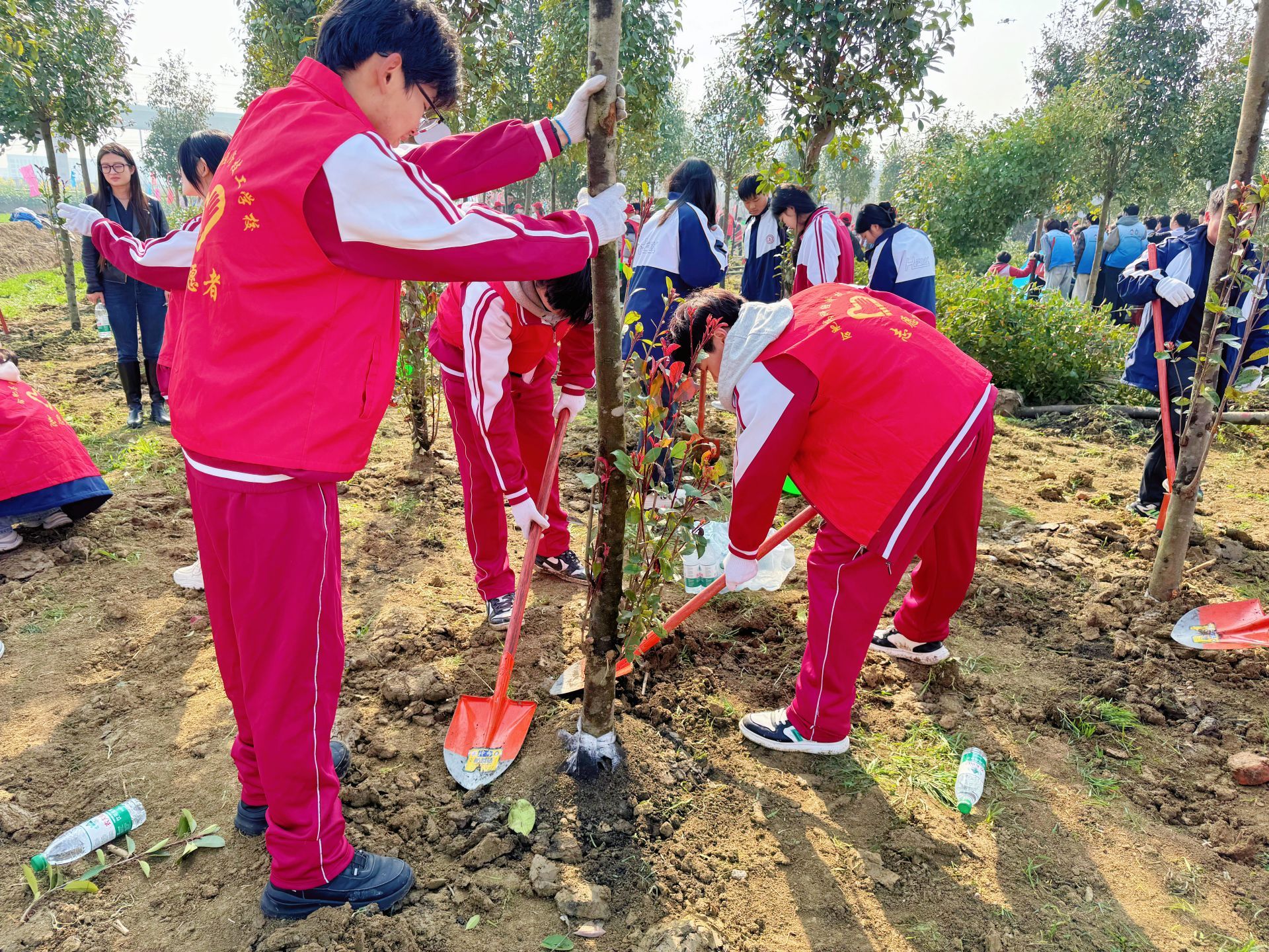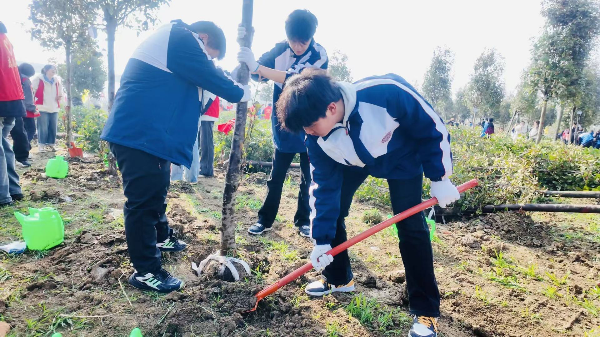 活动现场,我校学子分工协作、默契配合。大家挥锹铲土、扶苗扶正、填土压实、提水浇灌,在专业人员指导下认真完成每一道工序。同学们热情高涨、干劲十足,认真种下每一株树苗,让新绿在土地上扎根生长。